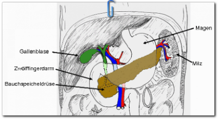 Die Bauchspeicheldrüse (Pankreas) ist ein zentrales Organ des oberen Verdauungstraktes. Das Pankreas liegt hinter dem Magen im Oberbauch. Es wird in einen Kopfbereich, einen Drüsenkörper und einen Schwanzbereich eingeteilt. Mit dem Kopfbereich hat die Bauchspeicheldrüse Kontakt mit dem Zwölffingerdarm (Duodenum) und dem Gallengangssystem (Ductus choldedochus). Der Drüsenkörper verläuft links neben der Wirbelsäule übergehend in den Schwanzbereich bis zur Milz im linken Oberbauch.